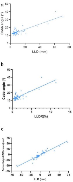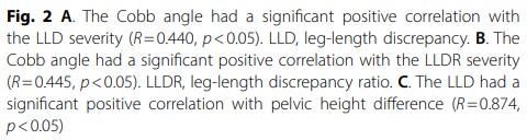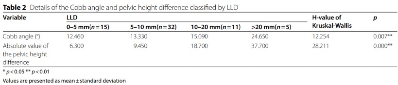 LLD¿Í °ñ¹Ý ³ôÀÌ Â÷ÀÌ °£¿¡´Â strong ¼öÁØÀÇ »ó°ü°ü°è°¡ °üÂûµÇ¾ú´Ù [R=0.874, P<0.05] (Fig. 2C). Kruskal–Wallis °ËÁ¤¿¡¼µµ LLD ±×·ì °£ Cobb angle°ú °ñ¹Ý ³ôÀÌ Â÷ÀÌ ¸ðµÎ¿¡¼ À¯ÀǹÌÇÑ Â÷À̰¡ È®ÀεǾú´Ù(p<0.05). (Table 2).